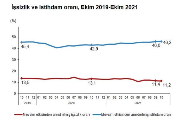 Türkiye genelinde 15 ve daha yukarı yaştaki kişilerde işsiz sayısı 2021 yılı Ekim ayında bir önceki aya göre 75 bin kişi azalarak 3 milyon 717 bin kişi oldu. İşsizlik oranı ise 0,2 puanlık azalış ile yüzde 11,2 seviyesinde gerçekleşti.