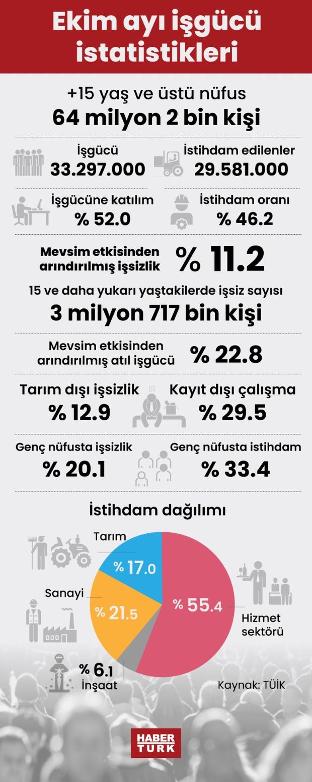 Ekim ayında sosyal güvenlik kuruluşuna bağlı olmadan çalışanların toplam çalışanlar içindeki payını gösteren kayıt dışı çalışanların oranı, bir önceki yılın aynı ayına göre 2,3 puan azalarak yüzde 29,5 olarak gerçekleşti. Tarım dışı sektörde kayıt dışı çalışanların oranı bir önceki yılın aynı ayına göre 2,6 puan azalarak yüzde 18,1 oldu.