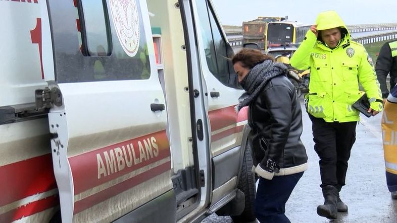 Bolluca İhsaniye Caddesinde, Arnavutköy-Kemerburgaz seferini yapan otobüs, kayganlaşan yolda savrularak bariyere çarptı.