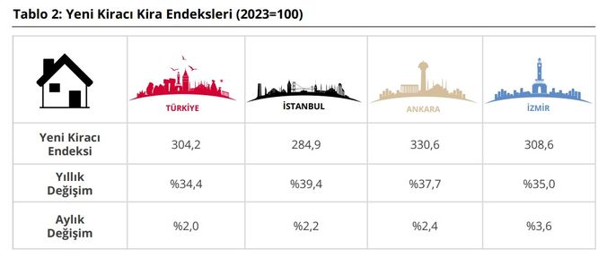 2026 yılı Mart ayında bir önceki aya göre yüzde 2,0 oranında artan Yeni Kiracı Kira Endeksi, bir önceki yılın aynı ayına göre nominal olarak yüzde 34,4, reel olarak ise yüzde 2,7 oranında arttı.