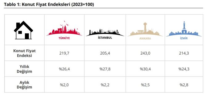 Konut Fiyat Endeksi, mart ayında bir önceki aya göre yüzde 2,0 oranında, bir önceki yılın aynı ayına göre nominal olarak yüzde 26,4 oranında arttı, reel olarak ise yüzde 3,4 oranında azaldı. Konutta son 26 ayın 25'inde reel düşüş görüldü.