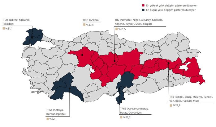Mart 2026 döneminde en yüksek yıllık artış yüzde 31,5 ile Nevşehir, Niğde, Aksaray, Kırıkkale, Kırşehir, Kayseri, Sivas, Yozgat bölgesinde, en düşük yıllık artış ise yüzde 21,1 ile Edirne, Kırklareli, Tekirdağ bölgesinde gözlendi.