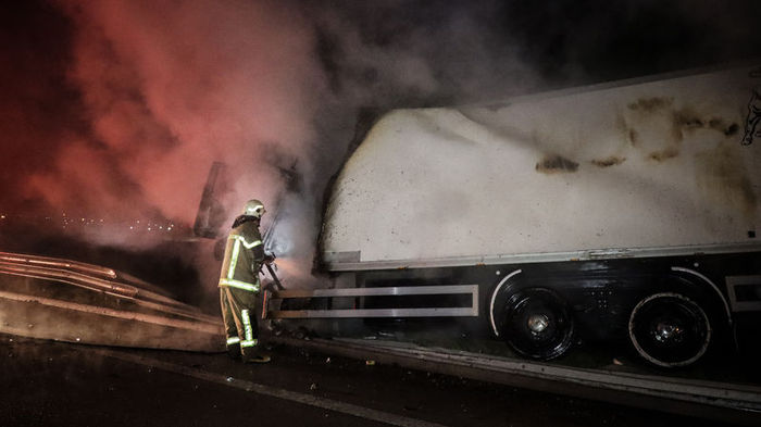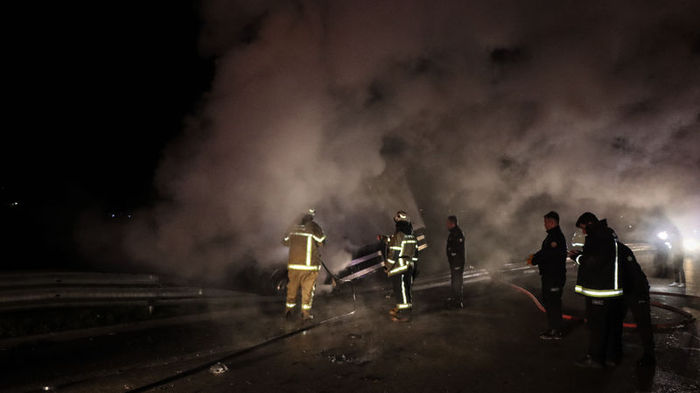 Bursa'da, yönlendirme direğine çarparak yanan kamyondaki 2 kişi hayatını kaybetti, 2 kişi ağır yaralandı.