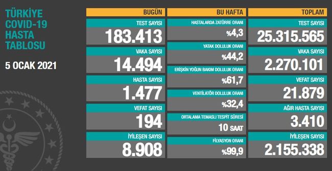 Ağır hasta 3 bin 303 oldu, 8 bin 702 kişinin Kovid-19 tedavisinin/karantinasının sona ermesiyle iyileşen sayısı 2 milyon 164 bin 40'a yükseldi.