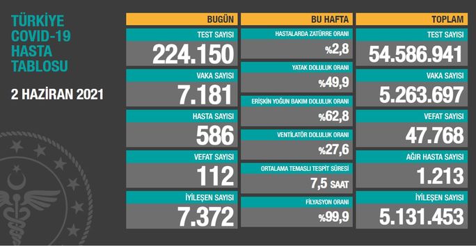 Sağlık Bakanlığı'nın 1 Haziran verilerine göre, 223 bin 482 test yapılırken semptom gösteren 602 hastayla birlikte 7 bin 112 yeni vaka tespit edilmişti. 129 kişi hayatını kaybederken 9 bin 457 kişi de sağlığına kavuşmuştu.