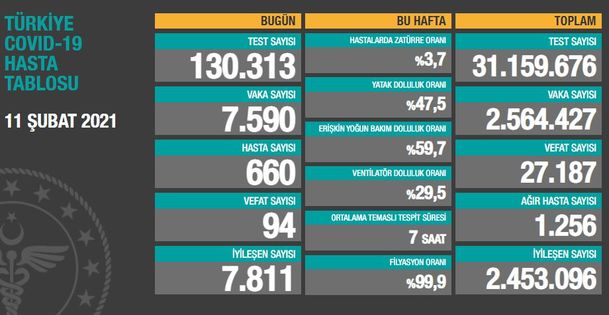 Test sayısı 31 milyon 159 bin 676'ya ulaştı. Vaka sayısı 2 milyon 564 bin 427, vefat sayısı 27 bin 187, ağır hasta sayısı 1256 oldu.
