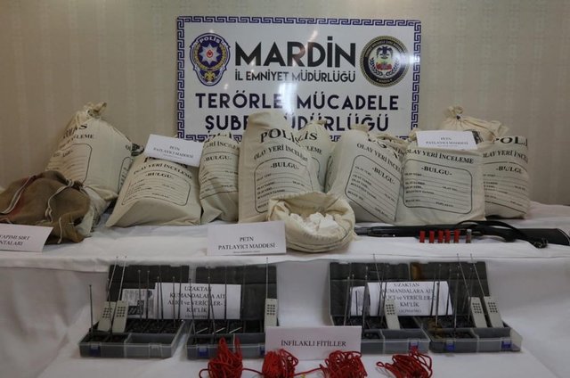 Mardin'de 32 ayrı bombalı saldırıda kullanılmak üzere yaklaşık 250 kilo patlayıcı bulundu. Patlayıcılarla birlikte 5 kişi gözaltına alındı. Patlayıcı maddenin Suriye’den Türkiye’ye getirildiği bildirildi.