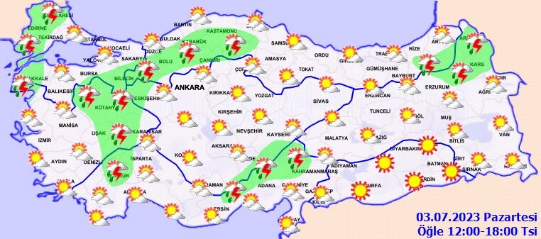 Meteoroloji'den yapılan son hava durumu tahminlerine göre; Trakya, Çanakkale, Ege'nin iç ve Batı Karadeniz'in iç kesimleri, Adana, Kahramanmaraş, Osmaniye'nin iç kesimleri ile Kars, Ardahan çevreleri gök gürültülü sağanak yağmurlu olacak. Hava sıcaklıklarında önemli bir değişiklik beklenmiyor