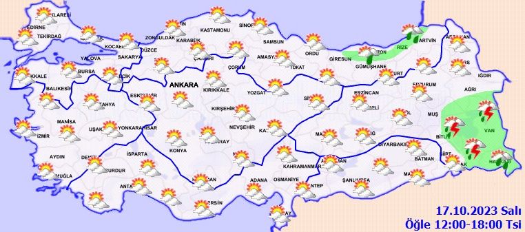Meteoroloji'den yapılan son hava durumu tahminlerine göre; Doğu Karadeniz kıyıları ile Hakkari, Van, Şırnak ve Bitlis çevreleri gök gürültülü sağanak yağışlı olacak. Diğer bölgeler az bulutlu ve açık geçecek.
