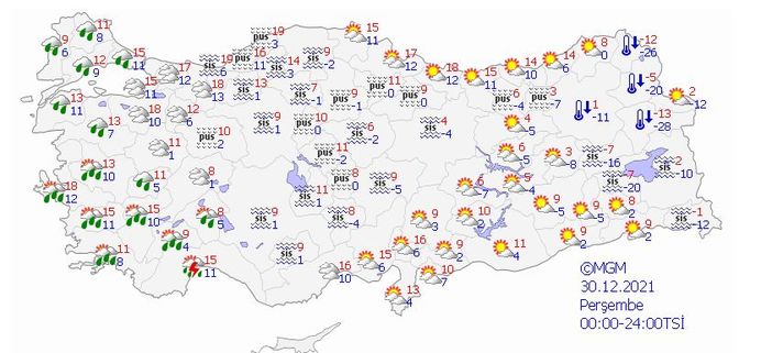 Yağışların Batı Akdeniz'in 1300 m ve üzeri kesimlerinde yer yer yoğun kar yağışı şeklinde olacağı tahmin ediliyor. Bu sabah ve gece saatlerinde iç ve doğu bölgelerde yer yer pus ve sis ile birlikte buzlanma ve don olayı bekleniyor.