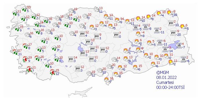 Meteoroloji Genel Müdürlüğü tarafından yapılan son değerlendirmelere göre ülkemizin kuzey, iç ve batı kesimlerinin parçalı ve çok bulutlu, Marmara, Ege, Batı Akdeniz, İç Anadolu'nun kuzeybatısı ile Konya'nın batısı, Bolu, Karabük, Düzce, Ordu ve Giresun çevrelerinin yağmur ve sağanak, Kıyı Ege ile Batı Akdeniz kıyılarının yer yer gök gürültülü sağanak yağışlı geçeceği tahmin ediliyor.