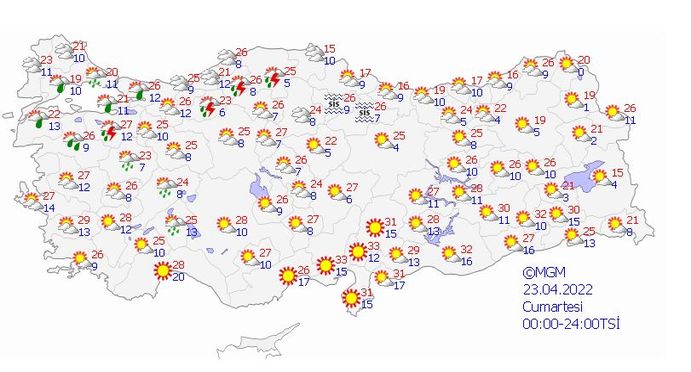 Meteoroloji Genel Müdürlüğü tarafından yapılan son değerlendirmelere göre sabah saatlerinde İstanbul, Bursa ve Yalova çevreleri ile Kocaeli'nin batısı ve Balıkesir'in kuzey kesimlerinin, öğle saatlerinden sonra Batı Karadeniz'in iç kesimleri ile Afyonkarahisar ve Isparta'nın kuzey çevrelerinin yerel olmak üzere sağanak ve gök gürültülü sağanak yağışlı geçeceği tahmin ediliyor.