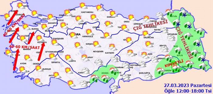 Meteoroloji Genel Müdürlüğü tarafından yapılan son değerlendirmelere göre: Ülkemiz genelinin parçalı ve çok bulutlu, Marmara, Kıyı Ege, Doğu Akdeniz ile Antalya ve Isparta çevreleri, Doğu Karadeniz ve Ordu çevreleri ile Doğu ve Güneydoğu Anadolu'nun doğu kesimlerinin genellikle yağmur ve sağanak yağışlı; Doğu Karadeniz’in yüksekleri ile Doğu Anadolu’nun kuzey ve doğusunun yükseklerinin karla karışık yağmurlu geçeceği; yağışların Güneydoğu Anadolu'nun doğusunda yerel kuvvetli olacağı tahmin ediliyor. Marmara'nın güneyi, İç Ege, İç Anadolu'nun batısı ve Batı Karadeniz'in iç kesimlerinde sabah saatlerinde pus, yer yer sis; Güneydoğu Anadolu’da toz taşınımı görülmesi bekleniyor. Doğu Karadeniz’in iç kesimleri ile Doğu Anadolu’nun eğimli ve yüksek kesimlerinde çığ tehlikesi riski bulunmaktadır.