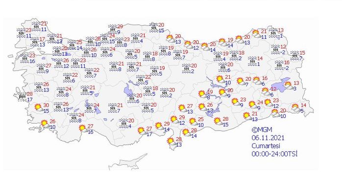 Meteoroloji Genel Müdürlüğü tarafından yapılan son değerlendirmelere göre; ülkemiz genelinde yağış beklenmiyor. Ülkemizin batı kesimlerinin parçalı bulutlu, diğer yerlerin az bulutlu ve açık geçeceği tahmin ediliyor. Kuzey ve iç kesimlerde yer yer pus ve sis hadisesi bekleniyor.