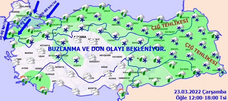 ÇIĞ TEHLİKESİ UYARISI: Doğu Karadeniz'in iç ve yüksek kesimleri ile Doğu Anadolu'da yüksek kar örtüsü bulunan eğimli yamaçlarda çığ riski olmasından dolayı meydana gelebilecek olumsuzluklara karşı dikkatli ve tedbirli olunması gerekmektedir.