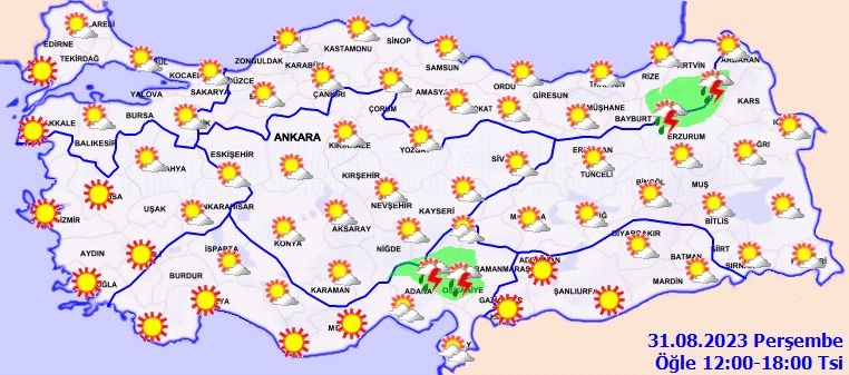 Meteoroloji Genel Müdürlüğü tarafından yapılan son değerlendirmelere göre: Ülkemizin doğu kesimlerinin parçalı bulutlu, Doğu Akdeniz Toroslar Mevkisi, Doğu Karadeniz'in iç kesimlerinin yüksekleri, Erzurum'un kuzey ilçeleri, Adana'nın kuzey kesimleri ve Osmaniye çevrelerinin yerel sağanak ve gök gürültülü sağanak yağışlı, diğer yerlerin az bulutlu ve açık geçeceği tahmin ediliyor.