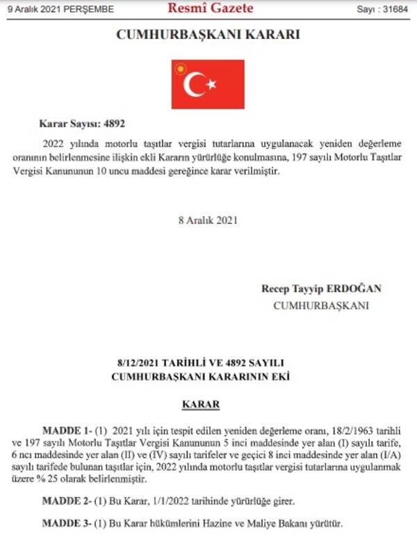 Buna göre, 2022 yılında Motorlu Taşıtlar Vergisi tutarlarına uygulanacak yeniden değerleme oranının belirlenmesine ilişkin ekli kararın yürürlüğe konulmasına, 197 sayılı Motorlu Taşıtlar Vergisi Kanununun 10’uncu maddesi gereğince karar verildi.
