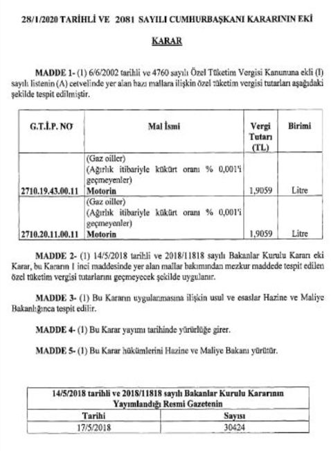 Motorinde uygulanan ÖTV oranı yükseldi. Resmi Gazete'de yayımlanan Cumhurbaşkanı karara göre motorinin litresinde uygulanan ÖTV miktarı 1.7945 liradan 1.9059 liraya yükseldi.