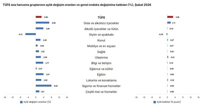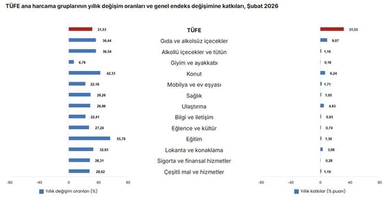 Şubatta yıllık enflasyon yüzde 31.53, aylık enflasyon yüzde 2.96 oldu. Gıda ve alkolsüz içecek fiyatları şubatta aylık olarak yüzde 6.89 yükseldi. Enflasyona en büyük katkı bu gruptan geldi