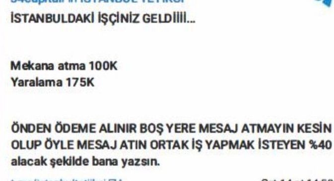 Şüphelilerin sosyal medya paylaşımlarında yer alan ifadeler ise dehşete düşürdü. İlanlarda; “İstanbul’daki işçiniz geldi. Mekana atma 100 bin., yaralama 175 bin., önden ödeme alınır. Boş yere mesaj atmayın, kesin olup öyle yazın. Her iş yapılır, fiyatlarımız uygundur” şeklinde ifadeler kullanıldığı tespit edildi.