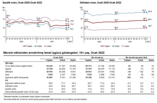 Hanehalkı İşgücü Araştırması sonuçlarına göre; 15 ve daha yukarı yaştaki kişilerde işsiz sayısı 2022 yılı Ocak ayında bir önceki aya göre 21 bin kişi artarak 3 milyon 859 bin kişi oldu. İşsizlik oranı ise değişim göstermeyerek yüzde 11,4 seviyesinde gerçekleşti. Erkeklerde işsizlik oranı yüzde 10,3 iken kadınlarda ise yüzde 13,6 olarak tahmin edildi.
