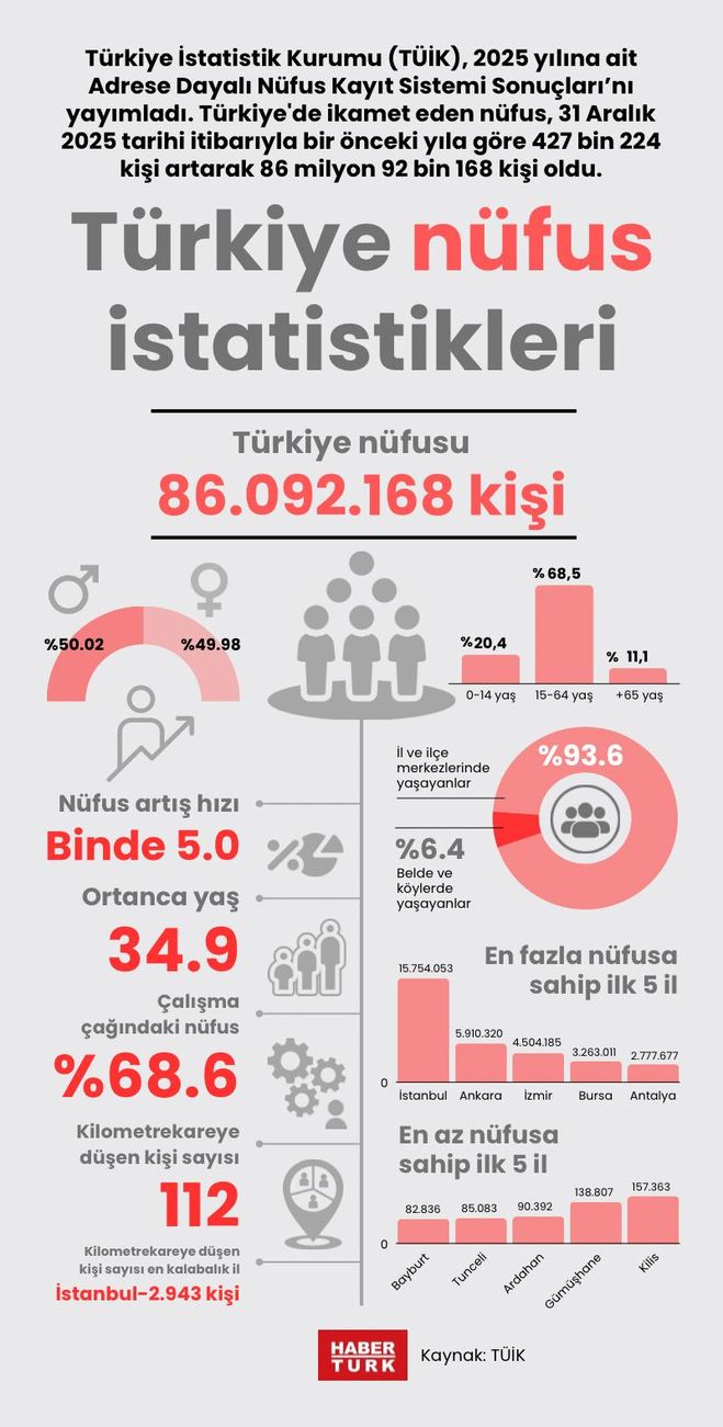 Türkiye'de ikamet eden nüfus, 31 Aralık 2025 tarihi itibarıyla bir önceki yıla göre 427 bin 224 kişi artarak 86 milyon 92 bin 168 kişi oldu. Erkek nüfus 43 milyon 59 bin 434 kişi olurken, kadın nüfus 43 milyon 32 bin 734 kişi oldu. Diğer bir ifadeyle toplam nüfusun %50,02'sini erkekler, %49,98'ini ise kadınlar oluşturdu.