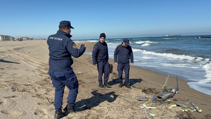 Sakarya'nın Karasu ilçesine bağlı Aşağı Aziziye Mahallesi mevkiinde öğle saatlerinde sahilde dolaşan vatandaşlar, deniz kıyısında parçalanmış halde insansız hava aracı gördü.