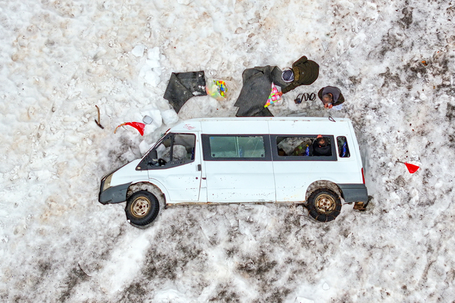 Van-Bahçesaray kara yoluna düşen çığda şarampole sürüklenen minibüsün sahibi İsmail Güncü, aracını bulunduğu yerden çıkarmak için bekleyişini sürdürüyor.