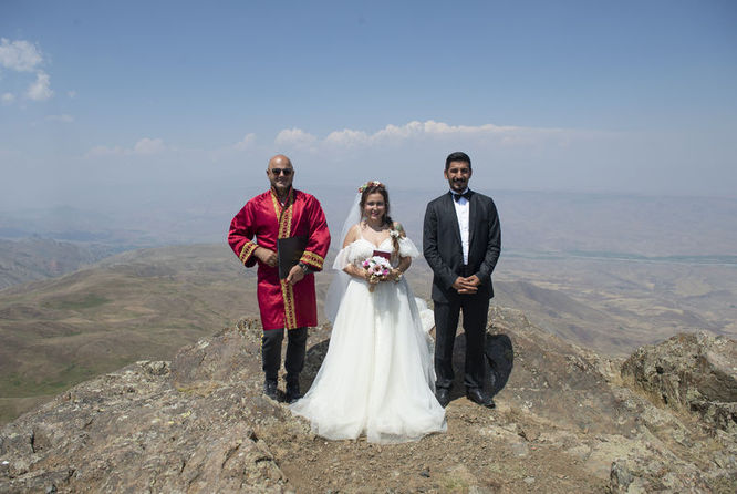 Dağcılarla zirveye çıkan Belediye Başkanı Türkan, zirvede cübbesini giyip genç çiftin nikahını kıydıktan sonra aile cüzdanını teslim etti. Çiftin dağcı arkadaşlarının şahitlik ettiği nikahın ardından zirvede müzik çalan dağcılar, eğlenip düğün halayı çekti.