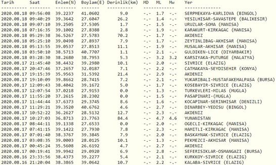 AFAD - KANDİLLİ RASATHANESİ SON DEPREMLER 18 AĞUSTOS 2020