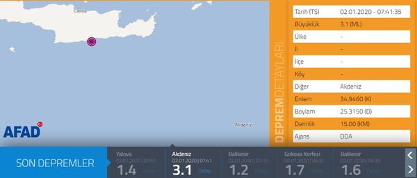 AFAD SON DEPREMLER LİSTESİ 2 OCAK