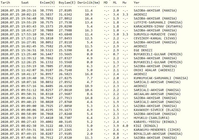 SON DEPREMLER 25 TEMMUZ 2020 (AFAD - KANDİLLİ RASATHANESİ)