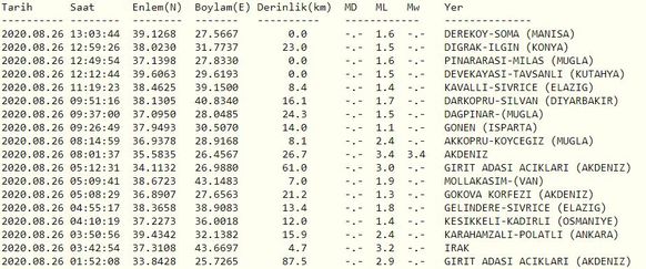 AFAD - KANDİLLİ RASATHANESİ SON DEPREMLER 26 AĞUSTOS 2020