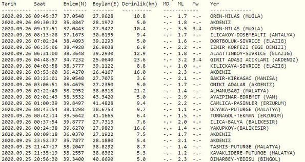 AFAD - KANDİLLİ RASATHANESİ SON DEPREMLER 26 EYLÜL 2020