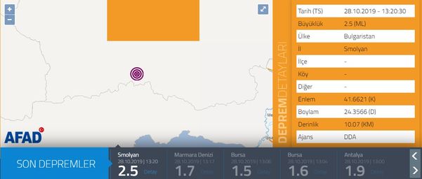 Tarih Saat Enlem(N) Boylam(E) Derinlik(km) MD ML Mw Yer Çözüm Niteliği ---------- -------- -------- ------- ---------- ------------ -------------- -------------- 2019.10.28 13:20:29 41.6582 24.2563 13.3 -.- 2.6 -.- BULGARISTAN İlksel 2019.10.28 13:00:35 37.2522 30.5795 2.2 -.- 2.2 -.- KARAOT-BUCAK (BURDUR) İlksel 2019.10.28 12:25:32 40.8805 28.2318 7.9 -.- 2.2 -.- SILIVRI ACIKLARI-ISTANBUL (MARMARA DENIZI) İlksel 2019.10.28 12:15:57 37.2247 27.8945 0.0 -.- 1.4 -.- KAYADERE-MILAS (MUGLA) İlksel 2019.10.28 11:58:12 37.2608 28.2235 0.0 -.- 2.0 -.- PASAPINARI-(MUGLA) İlksel 2019.10.28 11:50:07 37.5660 38.3198 5.0 -.- 1.9 -.- COBANDEDE-(ADIYAMAN) İlksel 2019.10.28 11:44:59 37.2342 27.8920 0.0 -.- 1.0 -.- CAMLIBELEN-MILAS (MUGLA) İlksel 2019.10.28 11:41:28 37.2017 27.8890 0.0 -.- 1.2 -.- KAYADERE-MILAS (MUGLA) İlksel 2019.10.28 11:08:25 36.9755 27.7695 8.0 -.- 1.4 -.- GOKOVA KORFEZI (AKDENIZ) İlksel 2019.10.28 11:03:04 38.8805 26.8773 8.9 -.- 2.8 -.- CANDARLI KORFEZI (EGE DENIZI) İlksel 2019.10.28 10:10:16 40.9028 28.2863 20.1 -.- 1.6 -.- MARMARA DENIZI İlksel 2019.10.28 09:20:20 38.5772 27.3518 3.6 -.- 1.4 -.- KAYAPINAR-(MANISA) İlksel 2019.10.28 09:16:32 37.2123 28.8720 12.2 -.- 1.6 -.- BEYAGAC (DENIZLI) İlksel 2019.10.28 08:25:24 37.1973 27.8537 0.0 -.- 1.1 -.- CAMKOY-MILAS (MUGLA) İlksel 2019.10.28 08:07:49 37.8197 29.7390 4.8 -.- 1.9 -.- CARDAK (DENIZLI) İlksel 2019.10.28 07:37:13 36.0223 27.3260 5.4 -.- 1.9 -.- AKDENIZ İlksel 2019.10.28 06:40:42 36.4632 28.6963 4.8 -.- 1.6 -.- AKDENIZ İlksel 2019.10.28 06:03:47 39.5230 33.2715 5.0 -.- 1.5 -.- UCEM-BALA (ANKARA) İlksel 2019.10.28 05:52:21 36.4747 28.6977 3.8 -.- 1.9 -.- AKDENIZ İlksel 2019.10.28 05:44:45 39.6582 27.8152 4.4 -.- 1.7 -.- KALAYCILAR-(BALIKESIR) İlksel 2019.10.28 05:31:59 36.4947 25.3740 9.1 -.- 2.3 -.- AKDENIZ İlksel 2019.10.28 05:00:14 39.6750 27.7382 12.0 -.- 1.5 -.- NAIPLI-(BALIKESIR) İlksel 2019.10.28 04:39:47 37.0298 29.2780 5.0 -.- 1.3 -.- CEVIZLI-CAMELI (DENIZLI) İlksel 2019.10.28 04:38:06 37.0175 29.2138 3.8 -.- 1.3 -.- EMECIK-CAMELI (DENIZLI) İlksel 2019.10.28 04:34:19 38.7523 37.7425 10.8 -.- 2.0 -.- TEMEKLU-KULUNCAK (MALATYA) İlksel