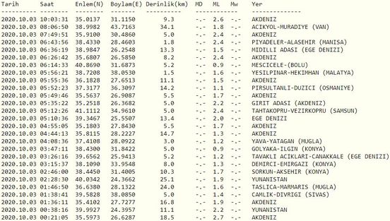 AFAD - KANDİLLİ RASATHANESİ SON DEPREMLER 3 EKİM 2020