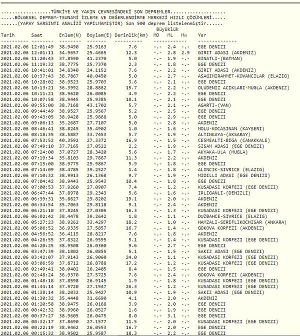 KANDİLLİ SON DEPREMLER LİSTESİ - 6 ŞUBAT