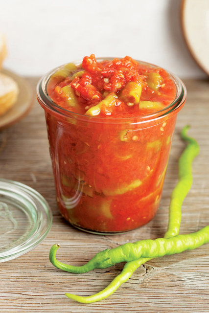 Ocaktan alıp içine kaya tuzunu, biberleri, sarımsakları, sirke ve yağı atıp karıştırın.