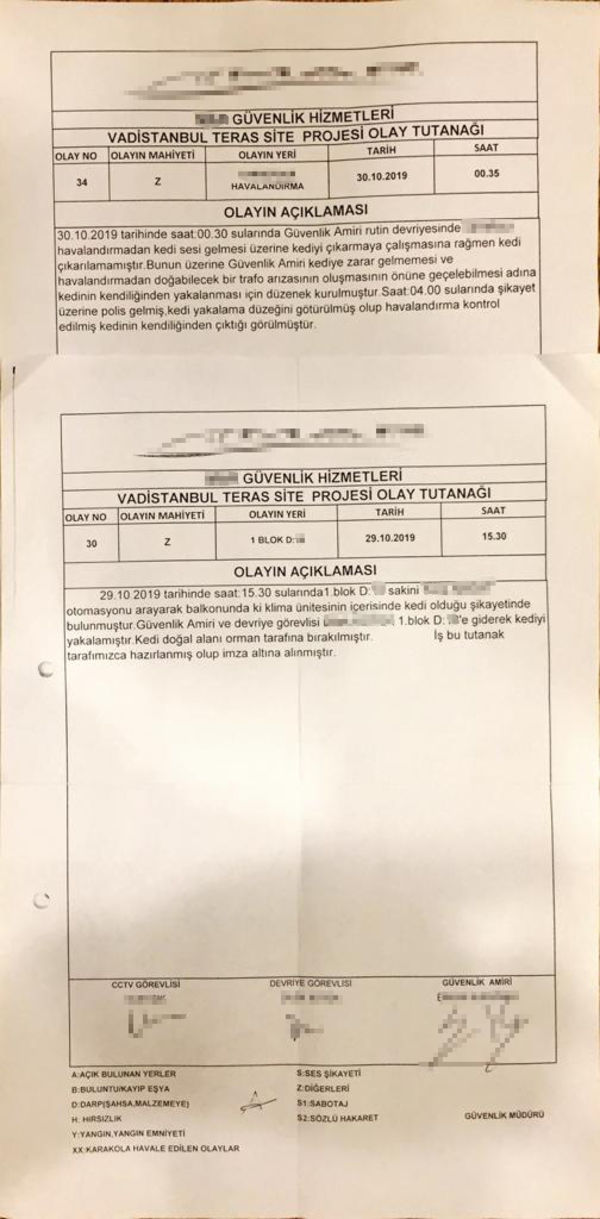 Site yönetiminden yapılan açıklamada, iddiaların gerçeği yansıtmadığı belirtilerek, "29.10.2019 tarihinde tutanakta belirtildiği gibi bir site sakinimiz otomasyonu arayarak balkonunda kedi sesi duyduğunu söyleyerek yardım talep etmiştir. Güvenlik amiri daireye çıkarak balkondaki klima ünitesinin içinde kedi olduğunu tespit etmiştir. Güvenlik amiri kediyi klima ünitesi içinden, sepet içerisine yiyecek koyarak çıkmasını sağlamıştır. Kediyi sitenin güvenlik girişindeki çimlerin üzerindeki kedi evlerinin yanına bırakmıştır.