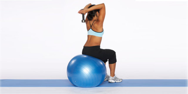 Pilates topunun ya da bir sandalyenin ortasına oturun. Bir elinizde dambıl olsun, ağırlığın bulunduğu kolu dirsekten 90 derecelik bir açıyla geriye doğru bükerek dambılı başınızın arkasına indirin, diğer elinizle de kolunuzu destekleyin. Bu pozisyondayken kolun sadece dirsekten sonrasını kullanarak dambılı yukarı kaldırın ve kolu düzleştirin. Her iki kolunuz için 12x2 set tekrar yapın.
