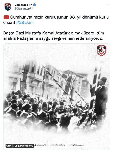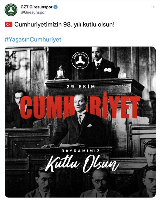 Spor camiası, Ulu Önder Mustafa Kemal Atatürk'ün kurduğu Türkiye Cumhuriyeti'nin 98. yıl dönümünü yayınladığı mesajlarla kutladı
