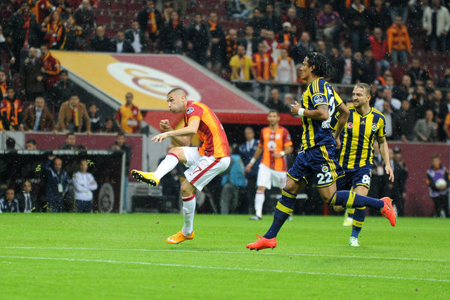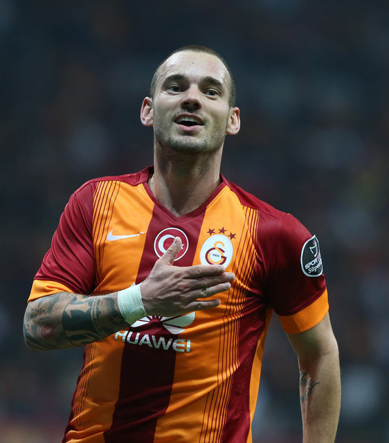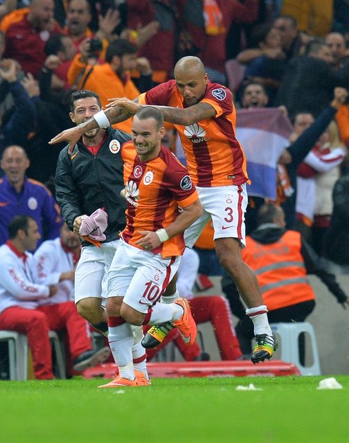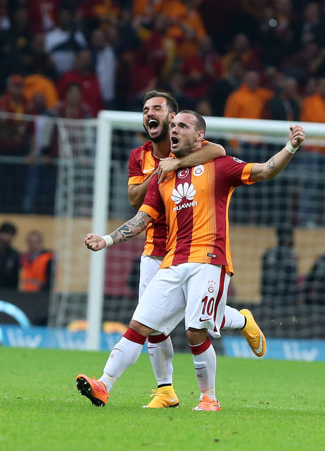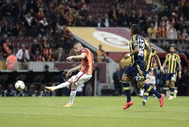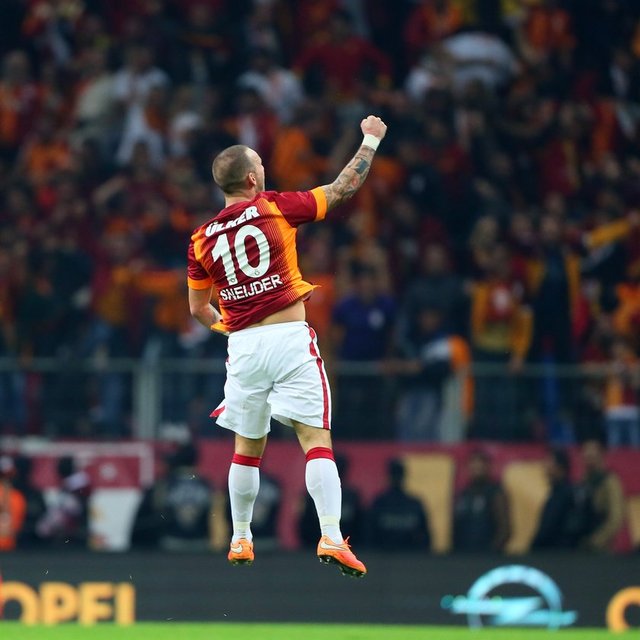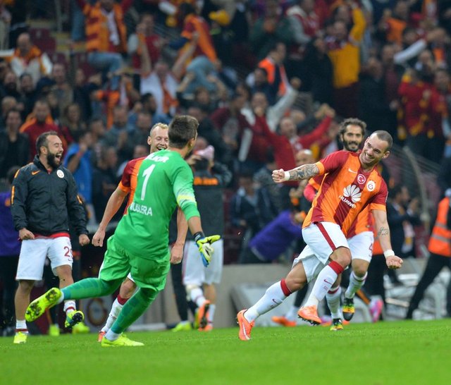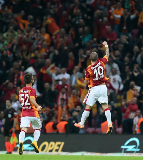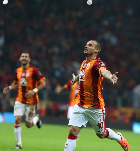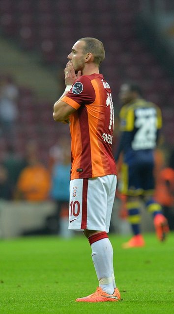 Fenerbahçe karşısında Galatasaray'ı galibiyete taşıyan gollere imzasını atan Wesley Sneijder, tribünleri ayağa kaldırdı.