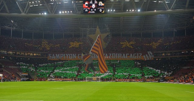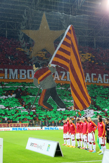 Taraftar grubu ultrAslan'ın yer aldığı Odeabank Tribünü'nde gerçekleştirilen kareografide, önce kartonlarla bir saha ve üzerinde 3 yıldız resmedildi. Daha, 4. yıldız ile sarı-kırmızılı eski teknik adam Graeme Souness'ın Fenerbahçe Şükrü Saracoğlu Stadı'na Galatasaray bayrağını dikmesinin gösterildiği iki ayrı resim makaralı sistemle tribüne çekildi.