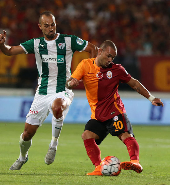 41. dakikada Lukas Podolski, Bursaspor cezasahasına doğru topla hareketlenirken yaklaşık 27 metre uzakta yerde kaldı. Serbest vuruşu kullanan Sneijder'in şutunda top barajvdan döndü.