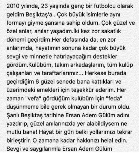 "Çok büyük isimlerle aynı formayı giyme şansına sahip oldum. Çok güzel ve özel anlar, anılar yaşadım. İki kez zor sakatlık dönemi geçirdim. Her defasında da en zor anlarımda hayatımın sonuna kadar çok büyük sevgi ve minnetle hatırlayacağım destekler gördüm. Kulübüm, takım arkadaşlarım, tüm kulüp çalışanları ve taraftarlarımız... Herkese burada geçirdiğim 6 güzel senede bana kattıkları ve üzerimdeki emekleri için teşekkür ederim. Her zaman 'vefa' gördüğüm kulübüm için 'feda' düşünmeme bile gerek olmayan bir durum oldu. Şanlı Beşiktaş tarihine Ersan Adem Gülüm adını yazdırıp, güzel anılarınızda yer alabildiysem ne mutlu bana. Hayat bir gün belki yollarımızı tekrar birleştirir. O zamana kadar hakkınızı helal edin."