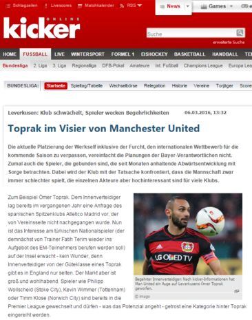 Alman basınından Kicker'ın iddiasına göre, Türkiye Milli Takımı'nında da savunma oyuncusu olan Ömer Toprak için Manchester United scout'larının harekete geçtiği öğrenildi.