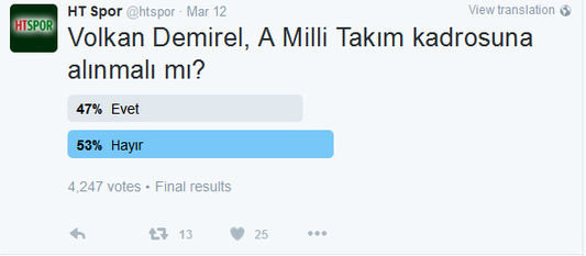 HTSPOR.COM'un Twitter hesabından yapılan ankette okuyucular Volkan Demirel için kararlarını verdi.