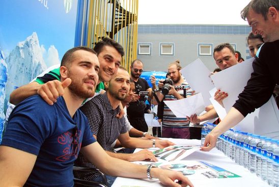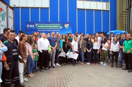 Bursasporlu futbolcular Şamil Çinaz, Ricardo Faty ve Harun Tekin kulübün sponsoru olan bir firmaya ait su üretim tesisinde düzenlenen imza etkinliğinde, işçilerle bir araya geldi
