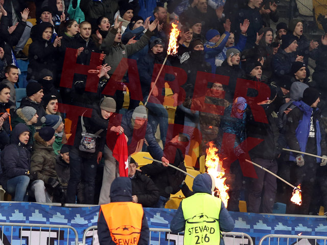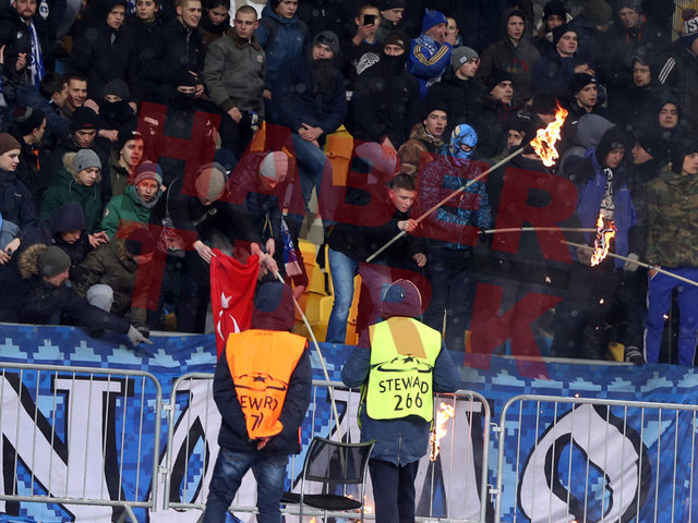 Medya mensupları için ayrılan bölgenin sol tarafında bulunan Kievliler, gazetecilerin sağ tarafında bulunan Beşiktaş taraftarına yanıcı maddeler, koltuk ve ses bombaları attı. Bunun üzerine sabrı taşan Siyah- Beyazlılar da, koltuk ve havai fişekler fırlatarak Kievliler’e karşılık verdi.