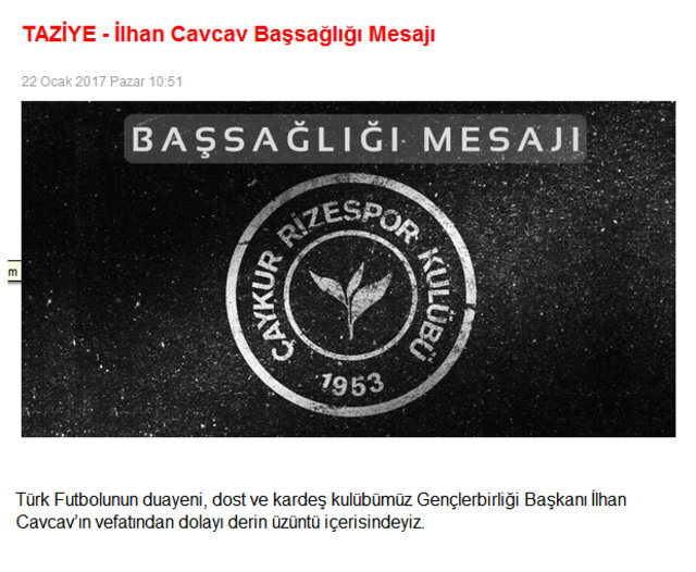 ÇAYKUR RİZESPOR KULÜBÜ: "Türk Futbolunun duayeni, dost ve kardeş kulübümüz Gençlerbirliği Başkanı İlhan Cavcav'ın vefatından dolayı derin üzüntü içerisindeyiz. Başta futbol ailesi olmak üzere; Gençlerbirliği Camiasının ve tüm sevenlerinin başı sağ olsun."